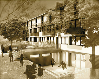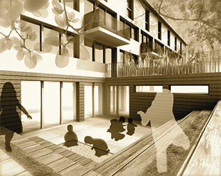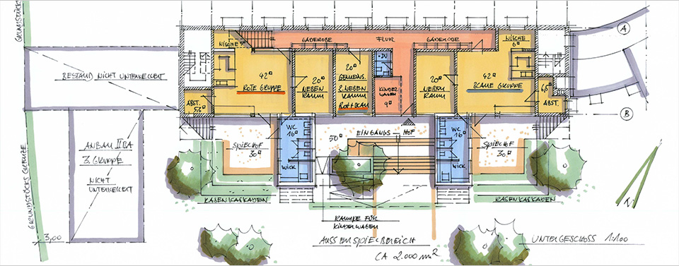 Der Betreiber der SKF Essen wünschte einen zeitgemäßen Umbau der im Untergeschoss befindlichen Kita-Gruppen für die Betreuung für Kinder unter drei Jahren. Die beiden Gruppen erhalten neue WC-Kuben mit Wickelbereich. Diese bilden in Verbindung mit Rasenkaskaden in treppenform absengte Spielhöfe mit Spielangeboten für Kleinkinder. Die Erschließung der Nutzungen im darüber liegenden Geschoss erfolgt über die jeweilige Dachfläche der vorgelagerten Nasszelle.