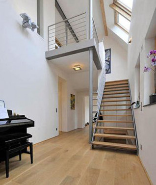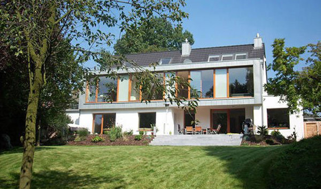 Ein 60 Jahre altes Gebäude wurde auf die Bedürfnisse des Bauherrn großflächig umgebaut und modernisiert. Der Eingangsbereich ist zu einer repräsentativen Halle mit einer modernen Treppenanlage und Galerie zum Obergeschoss umgestaltet worden. Durch die Anordnung einer breiten Gaube zum Garten über die gesamte Hausbreite wird die nutzbare Fläche des Obergeschosses wesentlich vergrößert. Großflächige raumhohe Verglasungen bieten den Bewohnern einen uneingeschränkten Blick auf das weitläufige Gartengrundstück.