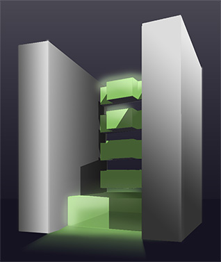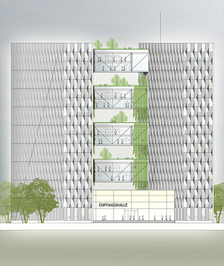 Brückenelemente entstehen begrünte Dachloggien mit Freiraumqualität. Eine intensive Fassadenbegrünung über die Terrassen hinaus in diesen Bereichen ist Grundlage für die Namensgebung des Gebäudes