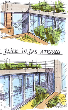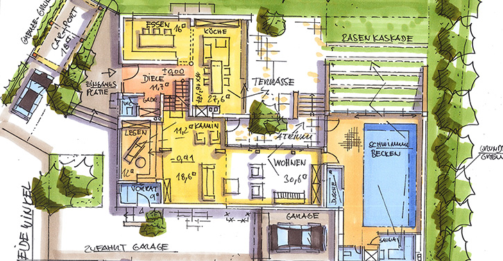Das vorhandene Gebäude ist auf die Anforderungen des neuen Erwerbers abgestimmt worden. Die getrennten Baukörper des Haupthauses und des Schwimmbades werden über eine Wohnraumerweiterung miteinander verbunden. Das sich hierdurch entwickelte, angrenzende Atrium wird dem Bauherrn durch skizzenhafte Darstellung der neuen räumlichen Situation verdeutlicht. Die Grundrissänderungen sind im Wesentlichen durch das Entfernen von Zwischenwänden geprägt. Diese Maßnahmen ermöglichen das Erleben der vorhandenen unterschiedlichen Ebenen sowohl innerhalb des Hauses als auch im Außenbereich. Es entstehen fließende Übergänge zu den einzelnen Wohnnutzungen, die der Immobilie einen modernen Charakter verleihen.