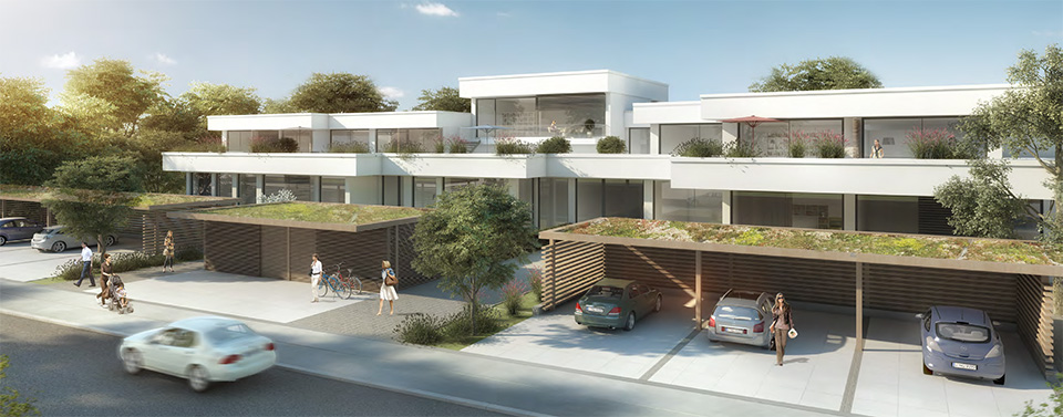 Dem Gebäude ist eine begrünte Carportanlage zur Minimierung der Verkehrsimmission vorgelagert. Die notwendigen Stellplätze der Wohneinheiten werden hier nachgewiesen, da die vorhandene Tiefgarage weiterhin vom Eigentümer als Autolager genutzt wird.