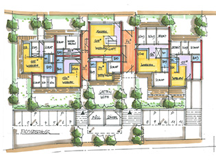 Der vorhandene Rohbau wird im Wesentlichen erhalten und durch Wohnungstrennwände und Zimmerwände ergänzt. Die große Raumhöhe des Erdgeschosses erlaubt tiefere Wohnungsgrundrisse als gewöhnlich, unter Beibehaltung der großflächigen Glasflächen an der Fassade.