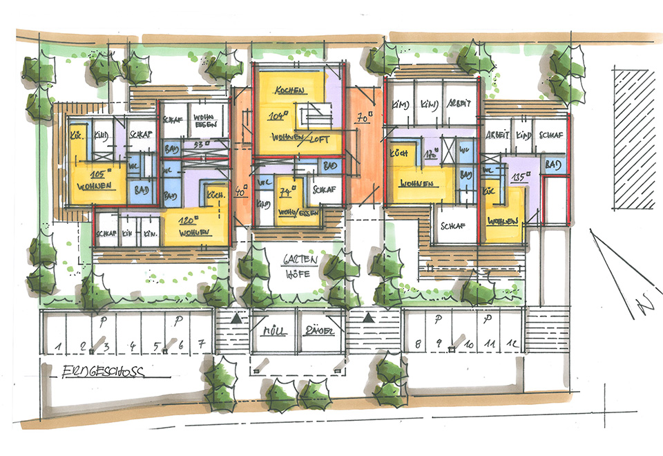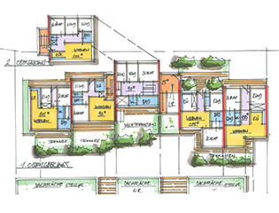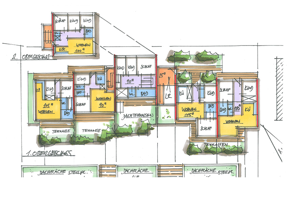 Im Obergeschoss wird die vorbereitete Aufstockung komplettiert und der gestalterischen Konzeption der Wohnungen im Erdgeschoss angeglichen. So entsteht ein harmonisches Gesamtensemble aus Wohnungen mit großflächigen Terrassen und begrünten Gartenhöfen.