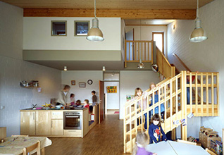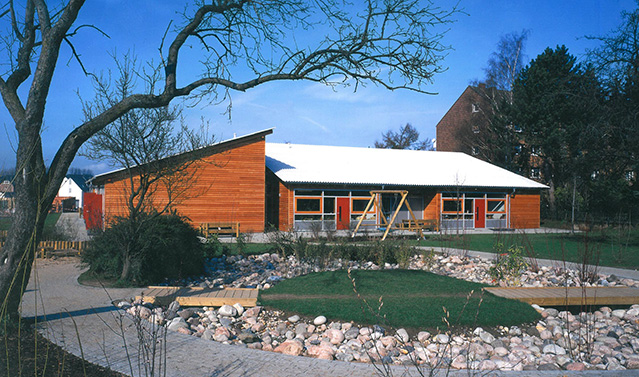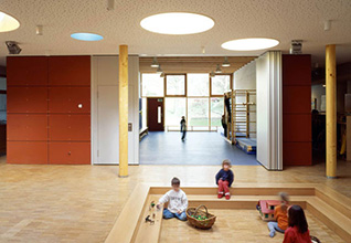 Diese Einrichtung für fünf altersgemischte Gruppen ist um eine zentrale Halle angeordnet. Sie bietet mit einer Sitzmulde und einer beweglichen Trennwand zum Mehrzweckraum eine zusätzliche Aufenthalts- und Versammlungsqualität. Die Gruppenräume sind zweigeschossig angelegt. Der Nebenraum bildet eine Empore des Hauptraumes und ist über eine Holztreppe mit diesem verbunden. 2010 wurde diese Kindertageseinrichtung um eine Gruppe erweitert und für die Aufnahme von Kindern unter drei Jahren ertüchtigt.
