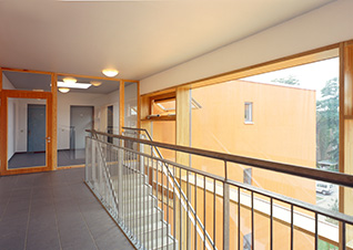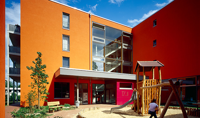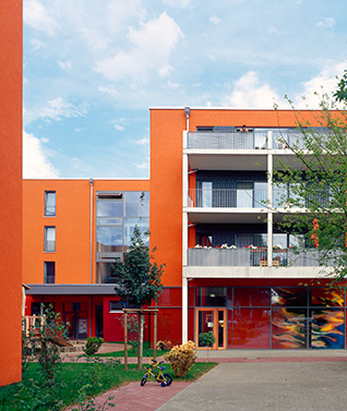 Dieses Mehrgenerationenhaus besteht aus zwei viergeschossigen Winkelgebäuden um einen Innenhof angeordnet. In den beiden Gebäuden befinden sich bis zu fünf Wohnungen pro Etage, die jeweils durch ein einläufiges Treppenhaus wirtschaftlich erschlossen werden. Um das Gemeindeleben an diesem Standort erhalten zu können, ist im Erdgeschoss eines Gebäudekomplexes ein Gemeindesaal mit Büroräumen für die Gemeindeverwaltung realisiert worden.